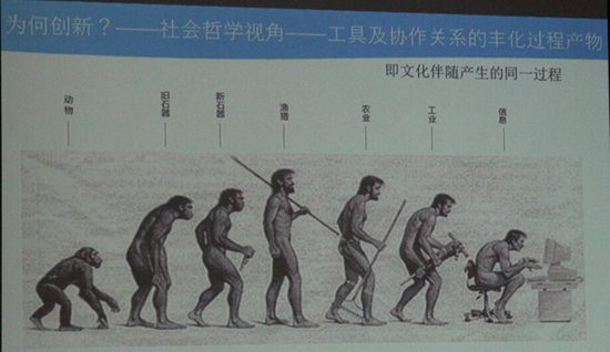 从社会哲学视角和人类发展历程来看,创新是工具及协作关系丰化过程的产物。渔猎时期的弓箭、农耕时期的锄头、工业时期的机床、不同时代有不同的 创新,与当时人类生存环境、生存格局相匹配。信息时代,就一定会有相应的信息工具来组织和协调人与人之间的关系,计算机、机器人、3D打印机等就是信息时 代的工具代表。